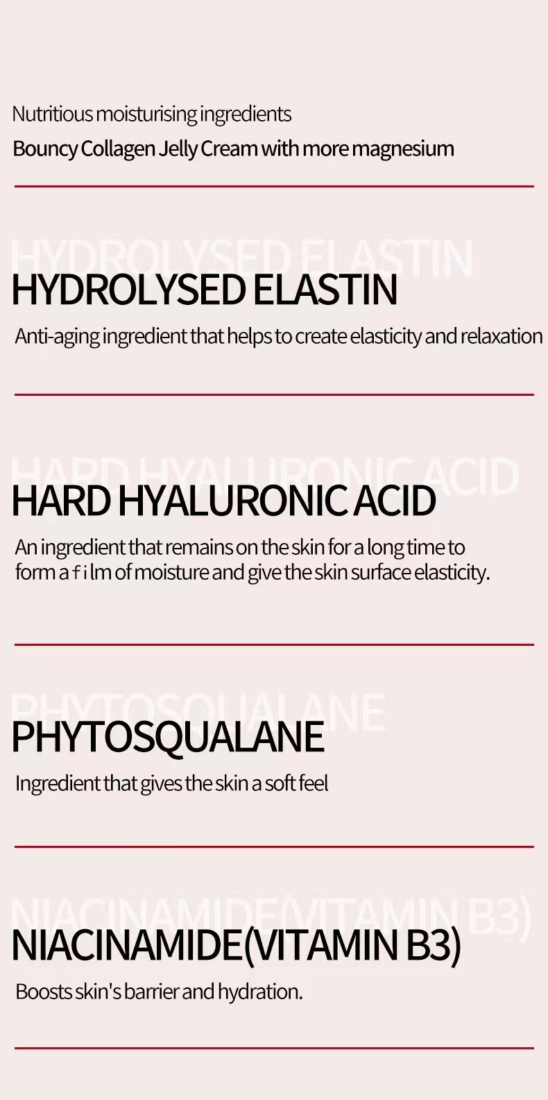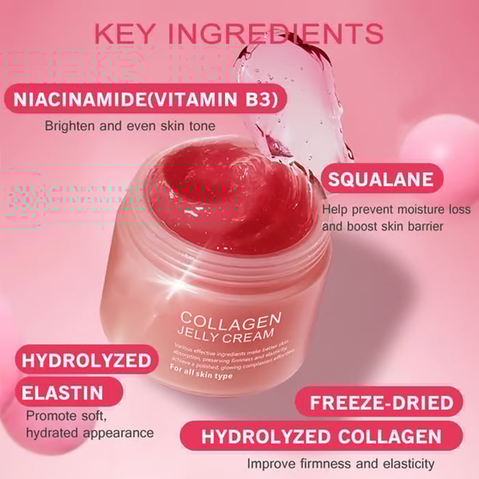 ✨ Key Ingredients: The Collagen Jelly Cream contains Niacinamide & Hydrolyzed Collagen.Hydrolyzed Collagen: small sized particles penetrate deep into the skin,enable better skin absorption, preserving firmness and elasticity, and Niacinamide enhances the skin's barrier function and boosts hydration for improved texture. barrier function and boosts hydration for improved texture