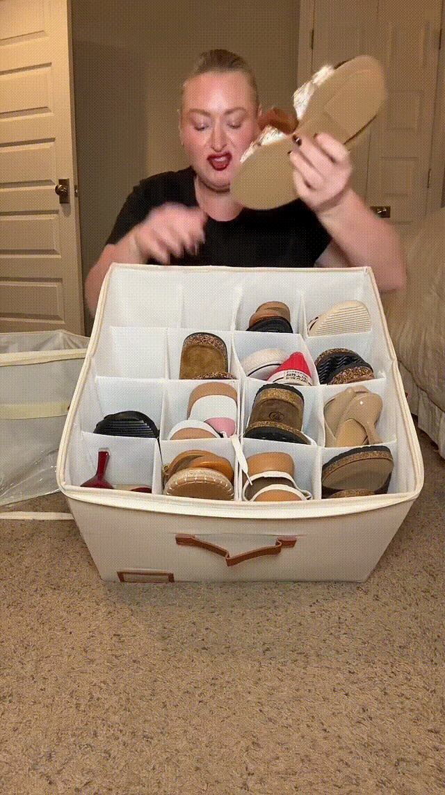 Holds up to 16 pairs of shoes (17.3"L × 17"W × 13"H) and features 4 reinforced handles for effortless lifting and moving.